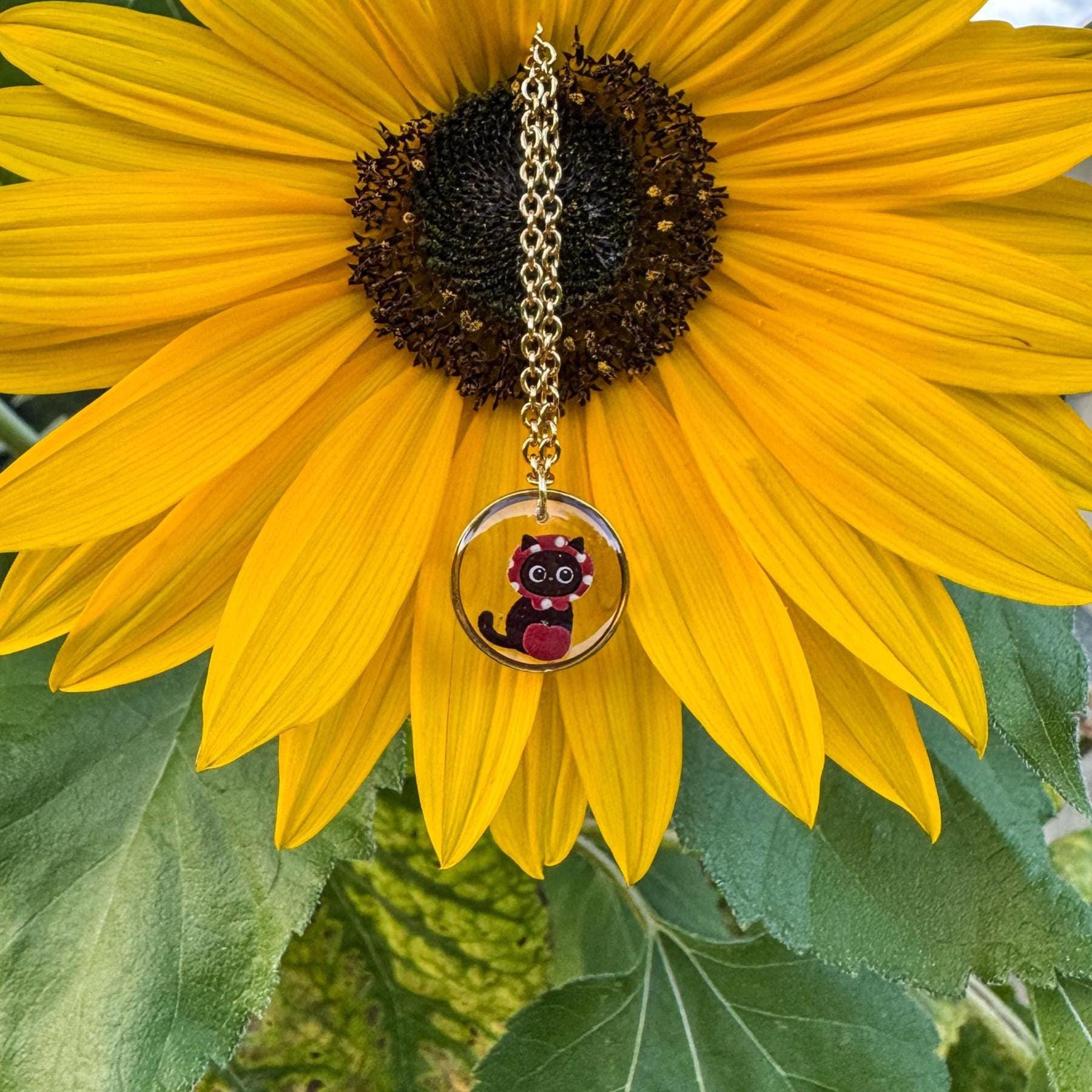 Im Anhänger befindet sich ein kleines schwarzes Kätzchen mit einem roten Kopftuch und einem roten Apfel, eingefasst in einen goldfarbenen Rahmen, an einer feinen Gliederkette. Das verspielte Design macht die Kette zu einem perfekten Accessoire für alle, die Tiere, besonders Katzen und zuckersüße Schmuckstücke lieben.