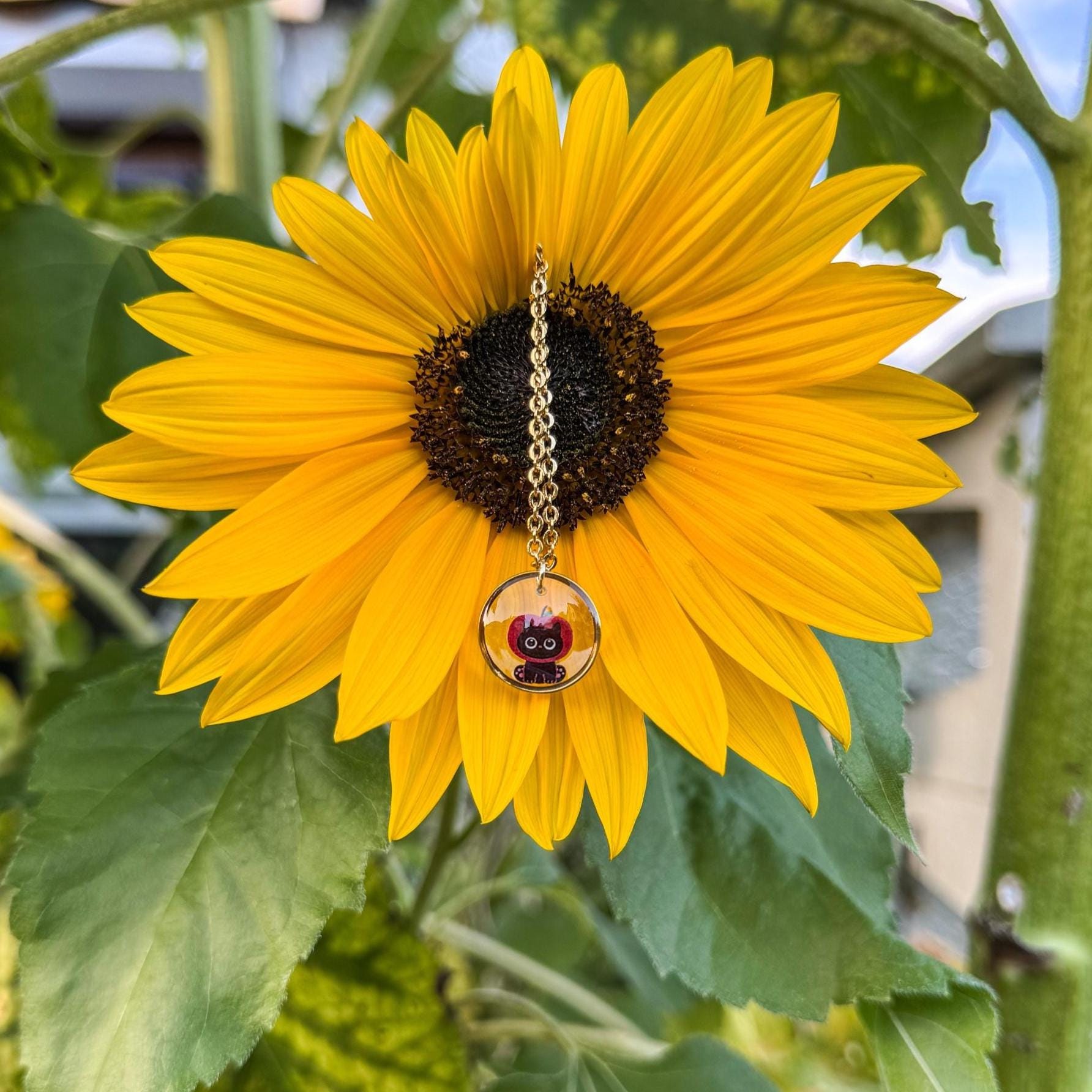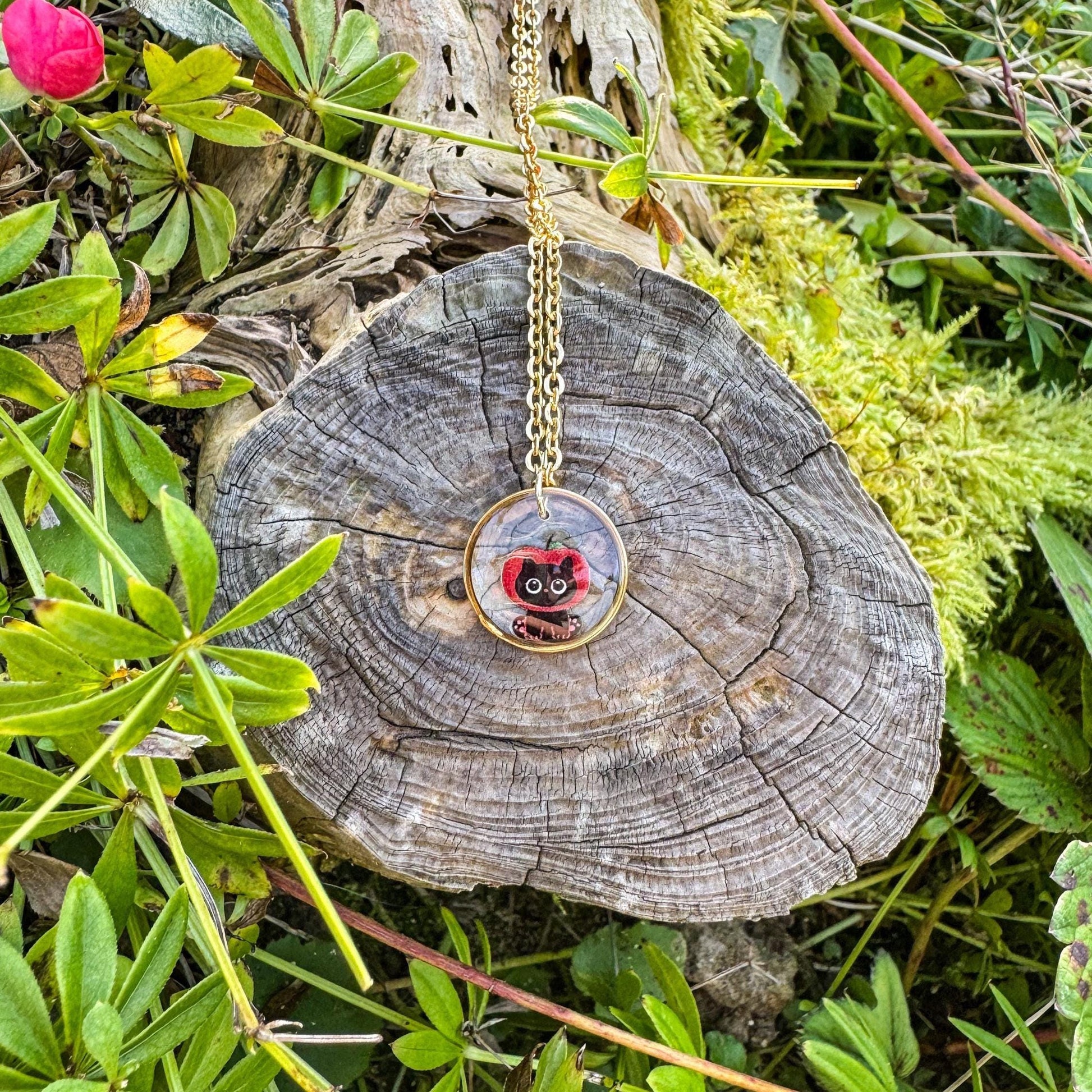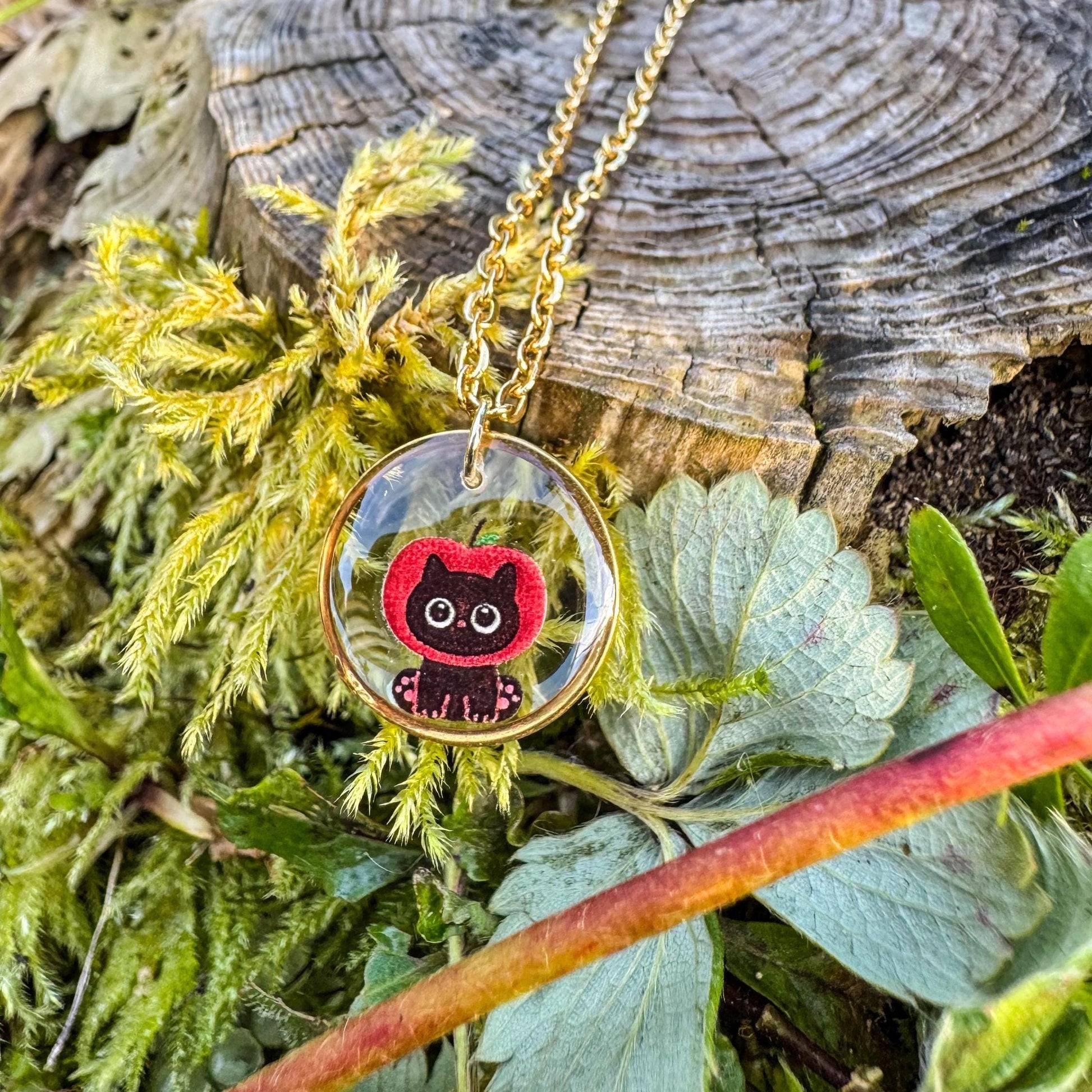 Im Anhänger befindet sich ein kleines schwarzes Kätzchen mit einem roten Apfel-Hut, eingefasst in einen goldfarbenen Rahmen, an einer feinen Gliederkette. Das verspielte Design macht die Kette zu einem perfekten Accessoire für alle, die Tiere, besonders Katzen und zuckersüße Schmuckstücke lieben.