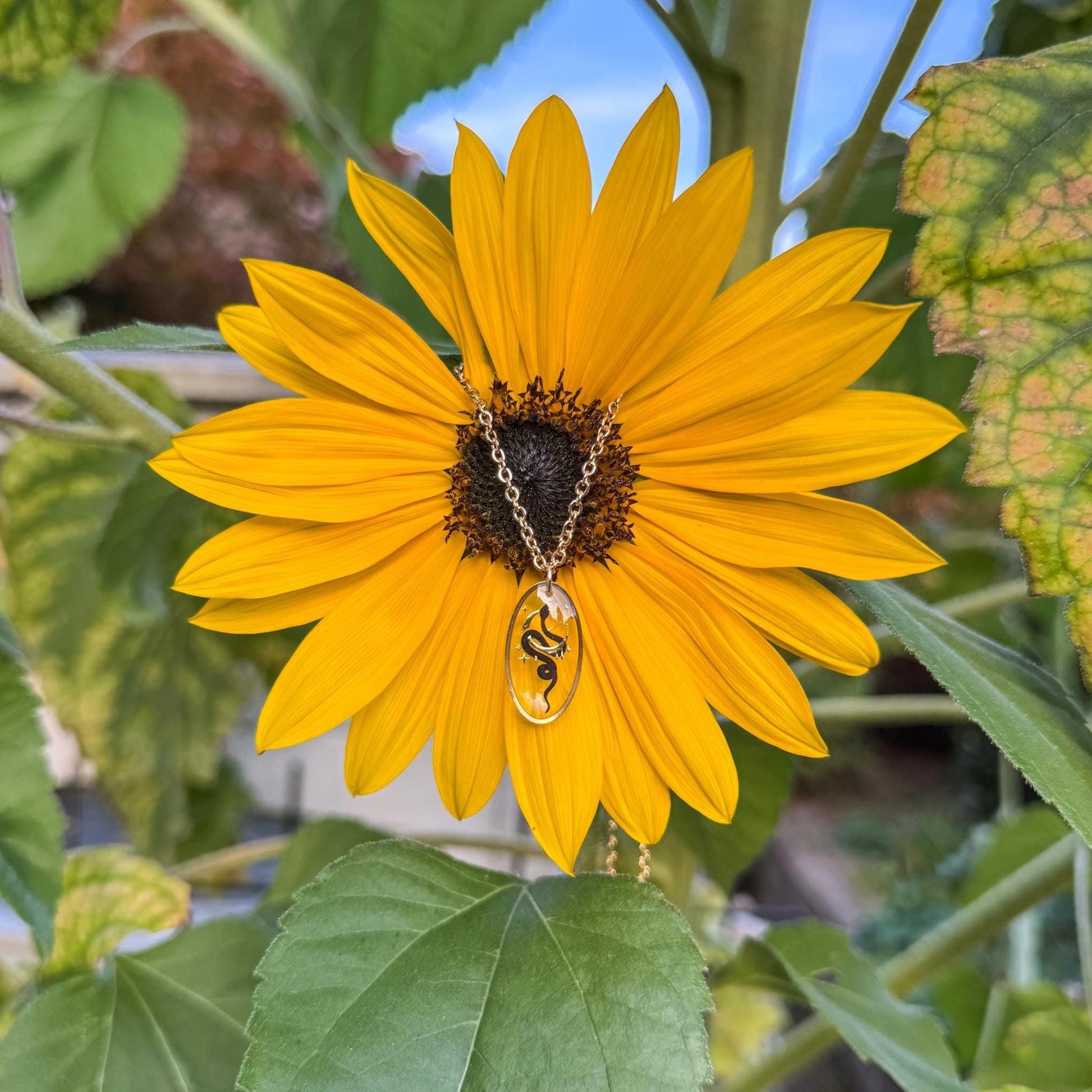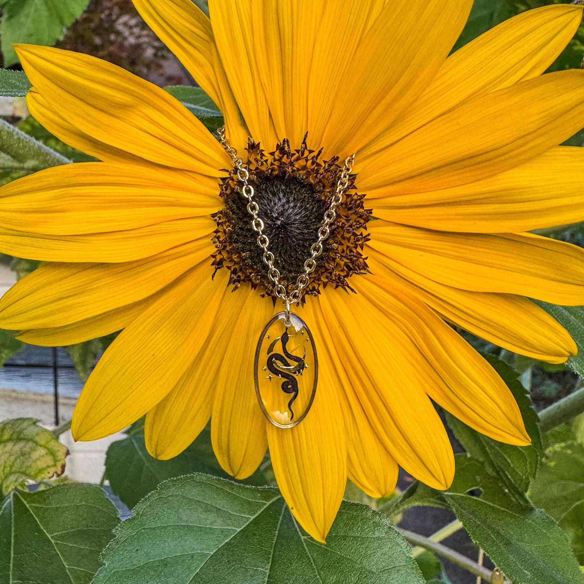 Im Anhänger befindet sich eine schwarze Schlange, die sich um einen goldenen Sichelmond schlängelt, eingefasst in einen goldfarbenen Rahmen, an einer feinen Gliederkette. Das magische Design macht die Kette zu einem perfekten Accessoire für alle, die Magie, Esoterik und witchy Schmuckstücke lieben.