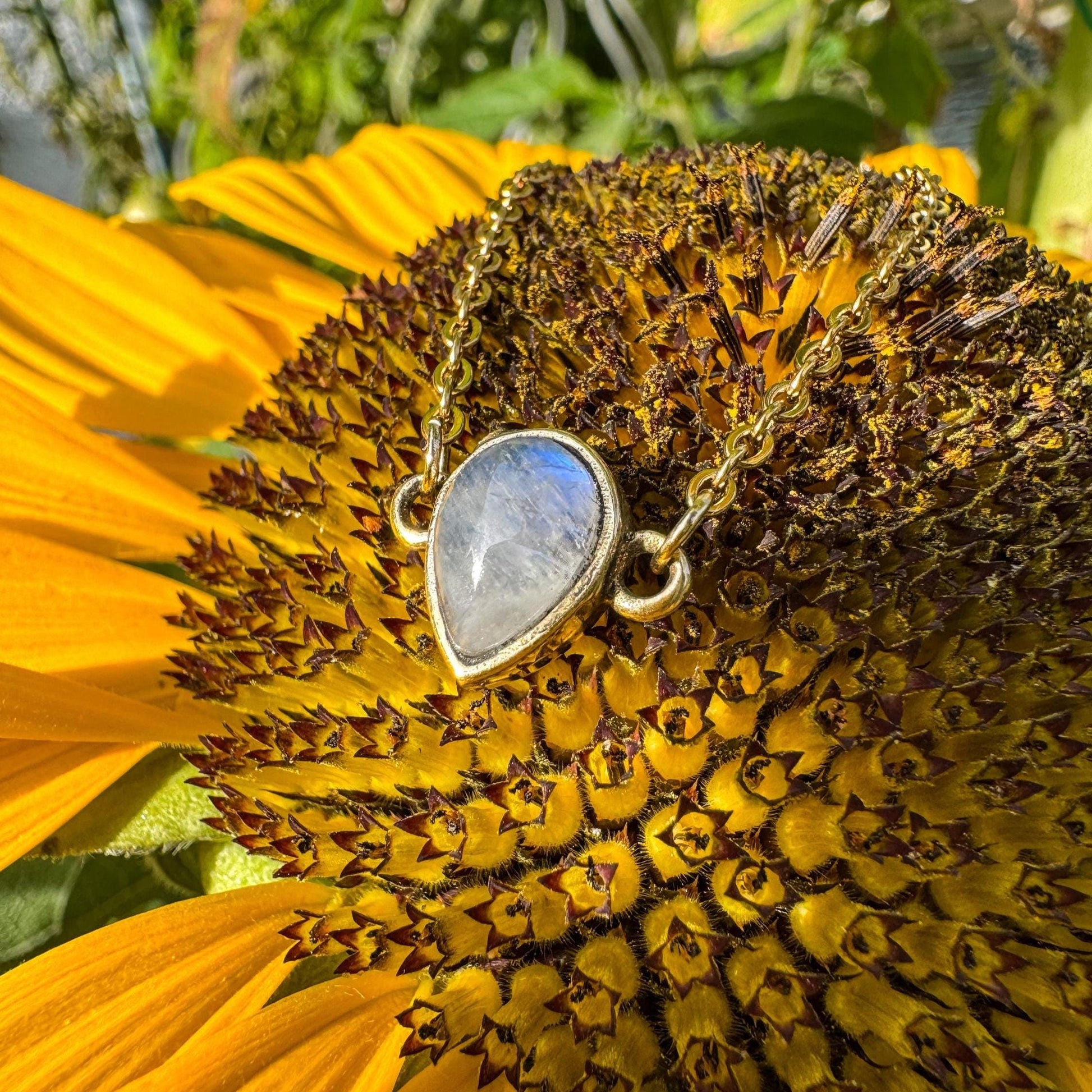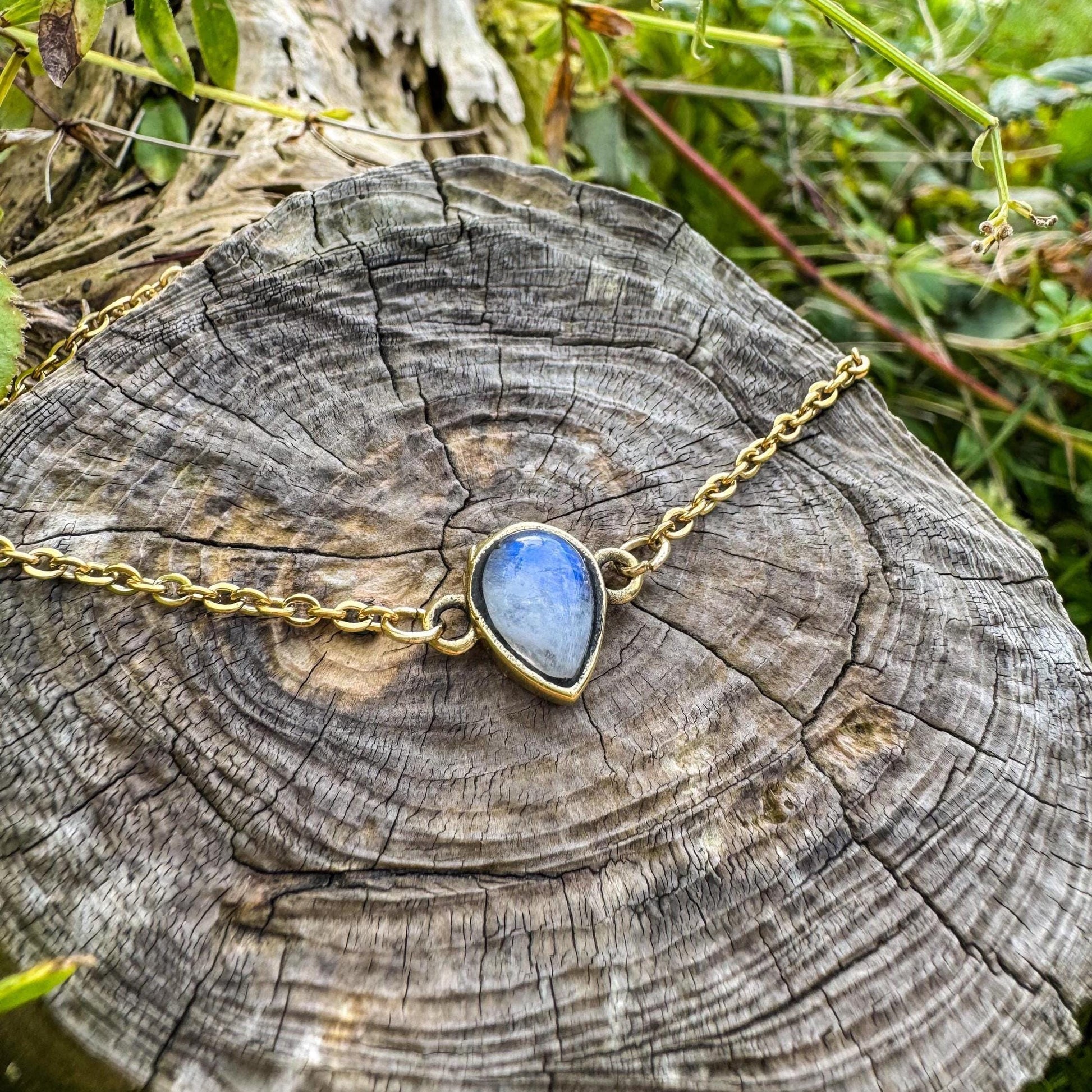 Dieses handgemachte Armband ist mit seiner zarten Kette und dem tropfenförmigen Anhänger mit einem natürlichen Mondstein ein echter Hingucker!